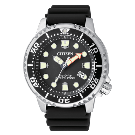 Vetro minerale, cinturino in caucciu’, Fondo serrato a vite. Corona a vite Ghiera girevole unidirezionale.