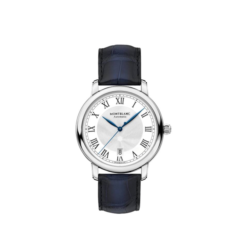 La linea Montblanc Star Legacy trae ispirazione dal patrimonio Minerva e dai suoi orologi tascabili realizzati fra la fine del XIX secolo e l’inizio del XX. In armonia con i codici di design della linea, il Montblanc Star Legacy Automatic Date presenta un raffinato quadrante bianco-argenté con motivo guilloché a stella variabile Montblanc, numeri romani, lancette a foglia, un motivo guilloché “filet sauté” e un’esclusiva minuteria “chemin de fer”. Il segnatempo è dotato del calibro automatico MB 24.01 ed è caratterizzato da ore, minuti e secondi centrali e dalla data situata in un’apertura a ore 6. Presenta una cassa in acciaio pregiato di 42 mm ed è corredato da un cinturino di tendenza in alligatore Sfumato blu realizzato nella Pelletteria Richemont di Firenze.