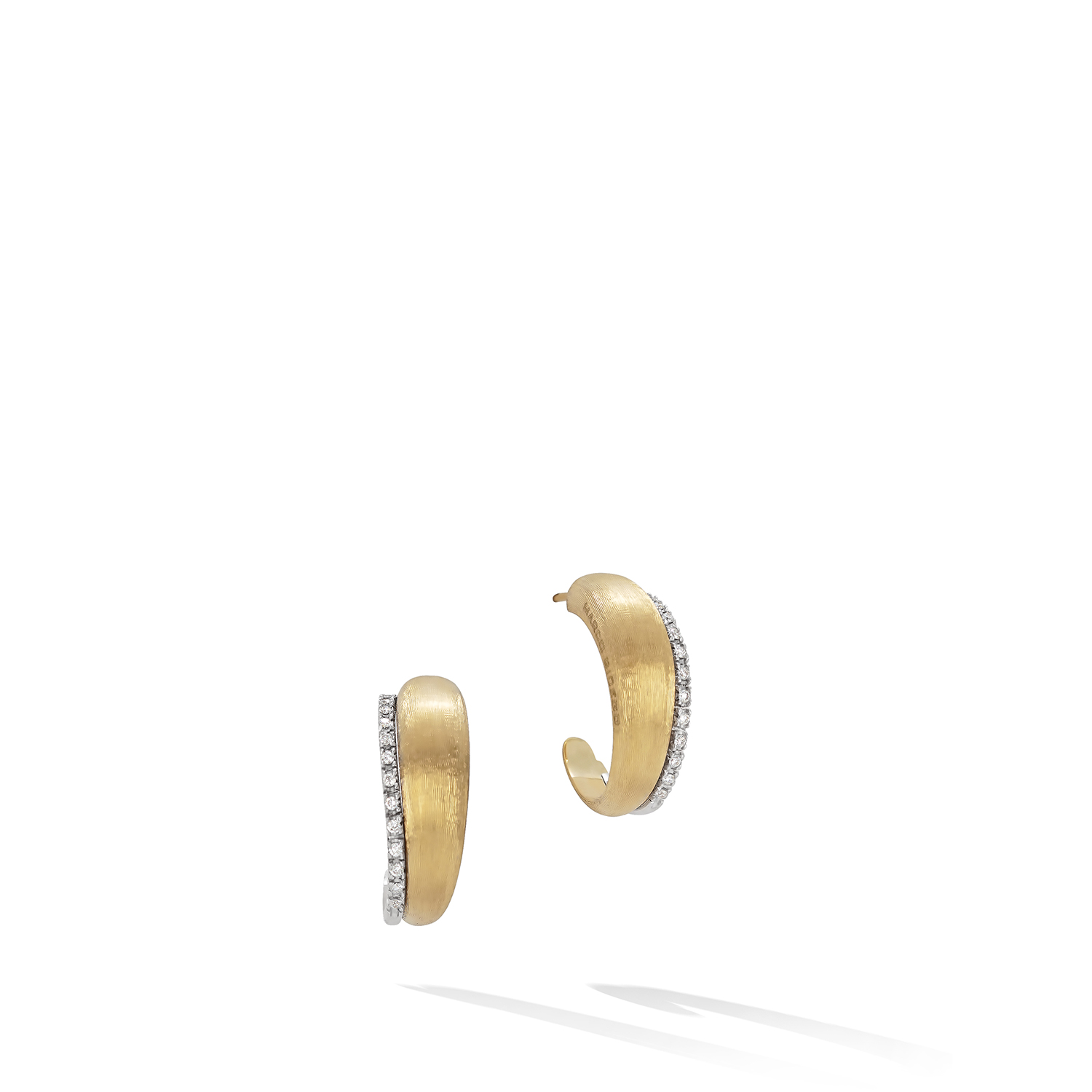 Orecchini in oro giallo 18 Carati incisi a mano con l’antica tecnica del Bulino. Questi gioielli montano 0,2 carati di Diamanti taglio Brillante.