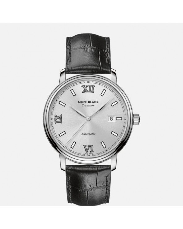 La Montblanc Tradition Collection sfoggia il caratteristico design Montblanc e i codici classici dell’arte orologiera. Il Montblanc Tradition Automatic Date presenta una cassa in acciaio pregiato da 40 mm con anse dritte e una lunetta doppia. Il segnatempo presenta un quadrante bianco argenté con numeri romani in rilievo finitura rodio e indici bianchi. La tradizionale minuteria “chemin de fer” e le classiche lancette a foglia e a bastone completano questo elegante look.
