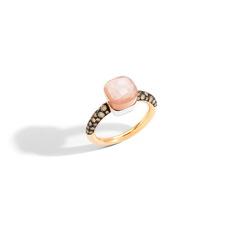 Anello Nudo in oro rosa e oro bianco con 1 pietra di luna e 36 diamanti brown